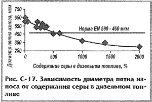 Смазывающая способность дизельного топлива зависит не только от содержания серы, но и от содержания ПАУ, фракционного состава и вязкости. При уменьшении содержания ПАУ, облегчении фракционного состава и снижении вязкости смазывающая способность низкосернистых топлив ухудшается. Смазывающая способность низкосернистых зимних и арктических дизельных топлив хуже, чем летних. Диаметр пятна износа при использовании различных марок дизельного топлива (содержание серы 200-350 мг/кг) составляет, мкм: летнее - 490-550; зимнее - 570-660; арктическое - более 650; газоконденсатное - 560-630. Показатель смазывающей способности был введен в нормативные документы на дизельное топливо европейского качества: ГОСТ Р 52368 и ТУ 38.401-58-296-2005. Смазывающая способность дизельного топлива определяется на приборе HFRR "High Frequency Reciprocating Rig" (EN ISO 12156-1, ASTM D6079). Образец топлива помещают в нагревательную баню заданной температуры. Закрепленную в вертикально установленном патроне стальной шарик прижимается к горизонтальной стальной пластине под действием приложенной нагрузки. Для обеспечения колебания шарика в HFRR используется электромагнитный вибровозбудитель. Шарик совершает возвратно-поступательные движения фиксированной частоты, при этом точки контакта находятся в испытуемом топливе. Металл шарика и пластины температура, нагрузка, частота и амплитуда колебаний, а так же окружающие условия строго регламентированы.